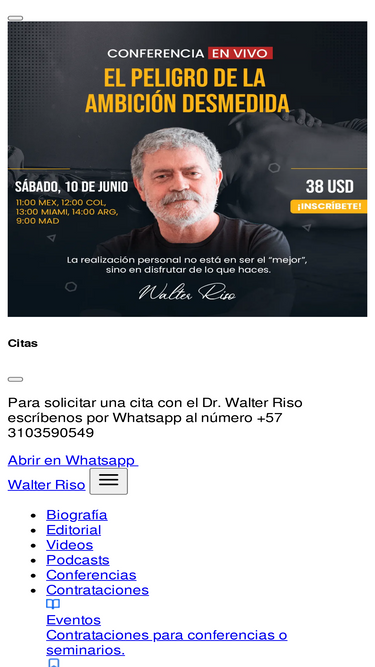 62%Walter Riso nació en Italia (Nápoles). Es Psicólogo Clínico, Especialista en Terapia Cognitiva y Magister en Bioética. Hace treinta años trabaja como psicólogo clínico y formador de terapeutas, práctica que alterna con el ejercicio de la cátedra universitaria en Latinoamérica y España, y la publicación de textos científicos y de divulgación, en diversos medios. Ha publicado 30 libros entre textos técnicos y de divulgación. Sus obras han sido traducidas a más de 20 idiomas, entre otros: chino, holandés, alemán, italiano, catalán, griego, esloveno, alemán e inglés. Actualmente reside entre Europa y América latina.