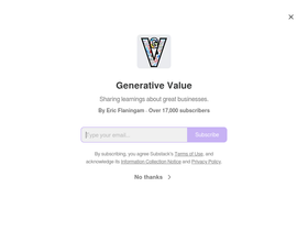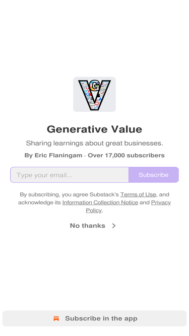 Sharing learnings about great businesses. Click to read Generative Value, by Eric Flaningam, a Substack publication with tens of thousands of subscribers.