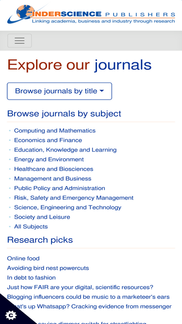 75%inderscience is a global company, a dynamic leading independent journal publisher disseminates the latest research across the broad fields of science, engineering and technology; management, public and business administration; environment, ecological economics and sustainable development; computing, ict and internet/web services, and related areas.