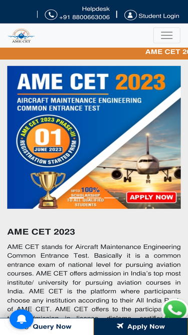 100%ame entrance test (ame cet) is a national level exam to offer admission in top colleges and universities of the aviation sector in india approved by dgca, easa, aicte, ugc, etc. ame cet also offers upto 100% of the scholarship to all qualified students.