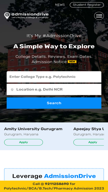 AdmissionDrive™ has brought up an easy way and India's biggest Admission Drive to get direct admission at UGC/Government-approved top universities and colleges in India without an entrance exam for Diploma, B.Tech, BCA, BBA, MBA, Design, Pharmacy, B.Ed, and other professional courses.
