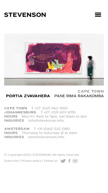 STEVENSON has an international exhibition programme with a particular focus on the region. Founded in 2003, the gallery has spaces in Cape Town and Amsterdam.