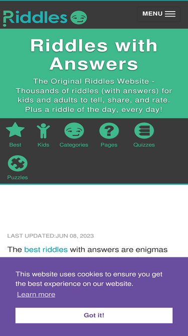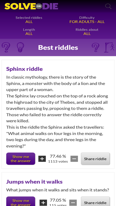 100%top 10 riddles are waiting for you. choose your difficulty, choose your topic and come to guess. we know the answers, and you? solve or ...