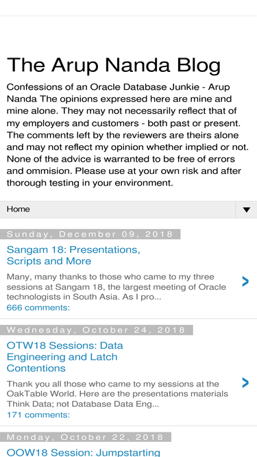 98%Confessions of an Oracle Database Junkie - Arup Nanda The opinions expressed here are mine and mine alone. They may not necessarily reflect that of my employers and customers - both past or present. The comments left by the reviewers are theirs alone and may not reflect my opinion whether implied or not. None of the advice is warranted to be free of errors and ommision. Please use at your own risk and after thorough testing in your environment.