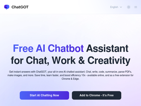 76%ChatGOT is a free AI chatbot assistant. Enhance writing, coding, summarizing, image creation with GPT-5, Claude 4, Gemini 2.5 and more AI models.