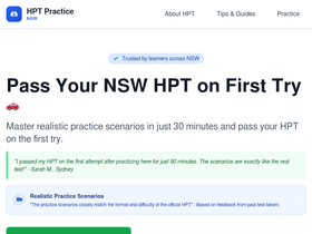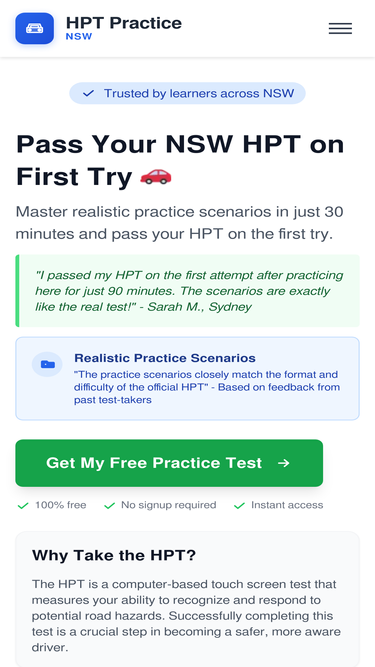 92%Free practice tests for the NSW Hazard Perception Test. Interactive scenarios, instant feedback, and tips to help you pass your HPT and get your P1 licence.