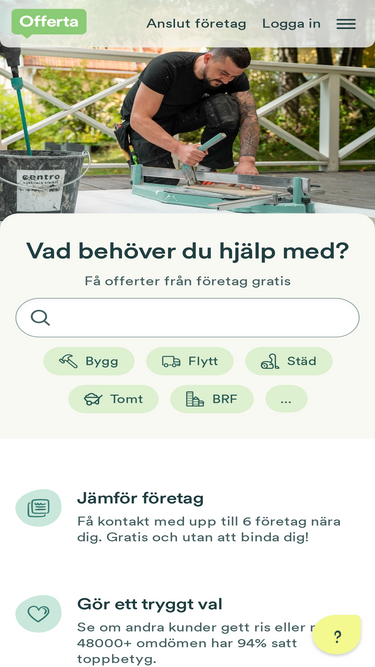 82%Hur fungerar Offerta? Kostar det något att lägga ut uppdrag? Här hittar du svaren på de vanligaste frågorna om Offerta.