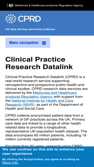 65%Clinical Practice Research DatalinkThe Medicines and Healthcare products Regulatory Agency10th Floor10 South ColonnadeCanary WharfLondon E14 4PUUnited Kingdomenquiries@cprd.com For press enquiries please contact the MHRA News Centre.