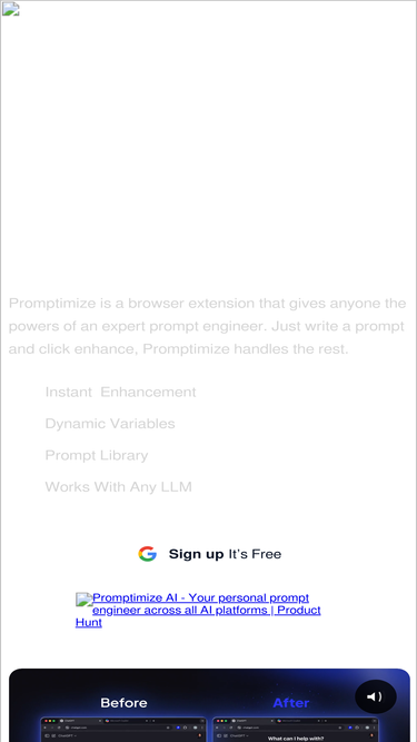95%Seamless Prompt Optimization. Elevate Your AI Prompts for Exceptional Results. Enhance your prompts with Promptimize—the AI-powered browser extension that refines your inputs for more impactful content generation. Grammarly for prompting.