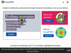 62%VisualPDE brings interactive science and mathematics to the web. Explore topics including waves, viruses and reaction—diffusion patterns, or create your own simulation.