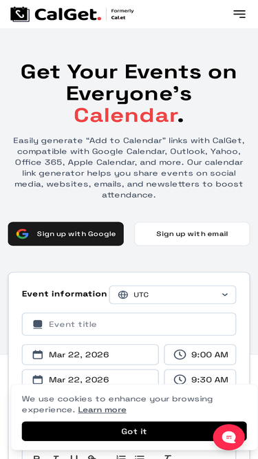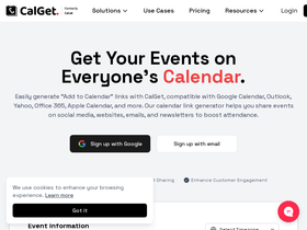 100%Generate add-to-calendar links with CalGet. Create calendar event links that work with Google, Outlook, Apple and more. Perfect for websites, emails and social media.
