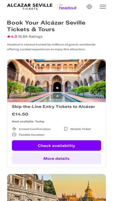 87%Book your Alcázar Seville tickets and choose from skip-the-line tickets, guided tours, and combos with other attractions & a Seville Hop-on Hop-off bus tour.