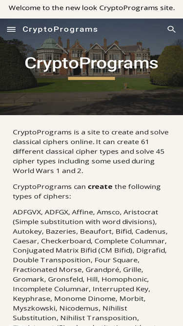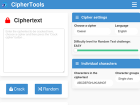 83%get ciphers cracked automatically, with the cracked texts presented in the words of their original language (english, french or german). either copy in your own ciphertext or get the website to set you a random ciphertext with varying lelves of difficulty. ciphertools also lets you create your own ciphers, and provides a full set of instructions and tips for cracking ciphers. ciphertools also features a working enigma and bombe machine so that you can decrypt enigma messages.