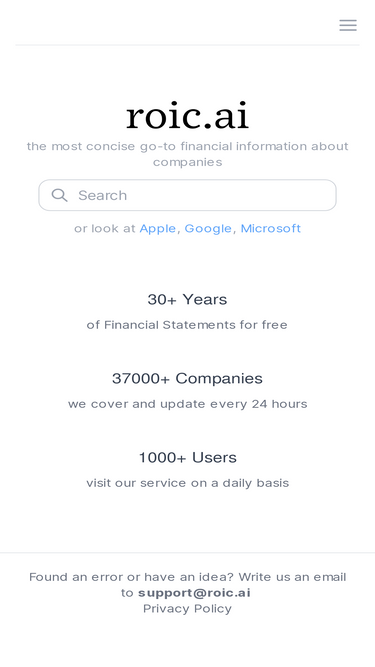 77%Whether you're a beginner or an experienced investor, Roic.ai has everything you need to make smart investment decisions. Take the first step to becoming a pro investor with us. Sign up for our service today and start your company analysis journey.