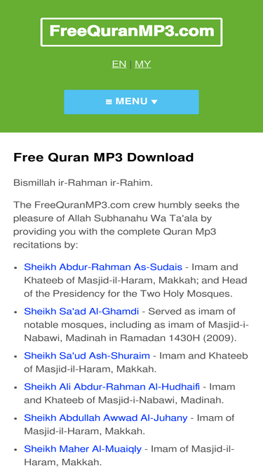 85%Masha'Allah, Free Quran MP3 download. Providing free and complete Quran MP3 files of Quran recitation by famous reciters, insha'Allah.