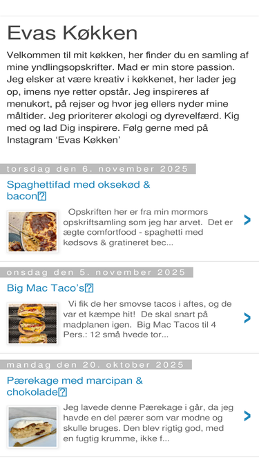 60%velkommen til mit køkken, her finde du en samling af mine yndlingsopskrifter. mad er min store passion. jeg elsker at være kreativ i køkkenet, her lader jeg op, imens nye retter opstår. jeg inspireres af menukort, på rejser og hvor jeg ellers nyder mine måltider. jeg prioriterer økologi og dyrevelfærd. kig med og lad dig inspirere. tilmeld dig gerne min facebookside "evas køkken" og få opdateringer v/nye indlæg