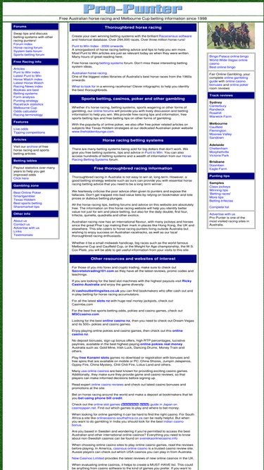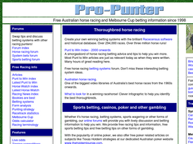 99%online gambling information includes free daily horse racing form newsletter, punting on free horse racing tips, free horse racing betting tips, horse racing tipping service, free horse racing ratings, wagering tips, internet bookmakers, betfair betting exchange, poker and sports betting tips and active sports, horse racing, gambling, online poker and football forums...pro punter.