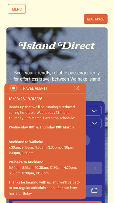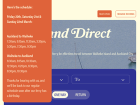 76%Travel between downtown Auckland and Waiheke Island with Island Direct. Ferries run daily from 6am till late. Book ahead for guaranteed seats or walk up and purchase a ticket from Pier 13 Downtown Auckland Hub. View the timetable, buy tickets, and explore the best of Waiheke with our friendly, easy & reliable service.