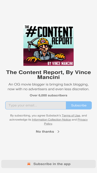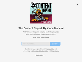 68%An OG movie blogger is bringing back blogging, now with no advertisers and even less discretion. Click to read The #Content Report, By Vince Mancini, a Substack publication with thousands of subscribers.