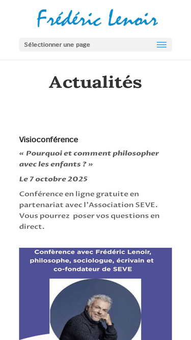 100%Frédéric Lenoir, site officiel. Vous trouverez ici les détails concernant mes livres, leurs traductions, un calendrier des conférences et autres rencontres, une rubrique pour écouter des podcasts, différents articles parus dans la presse, une page des lecteurs ainsi qu'un formulaire de contact.