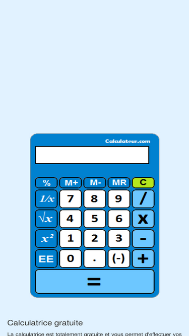 94%calculatrice en ligne gratuite avec l'ensemble des fonctions de base : addition, soustraction, multiplication, division, racine carrée, pourcentage, exposants, puissances. calculatrice adaptée pour un affichage aussi bien sur mobile que sur ordinateur et tablette.