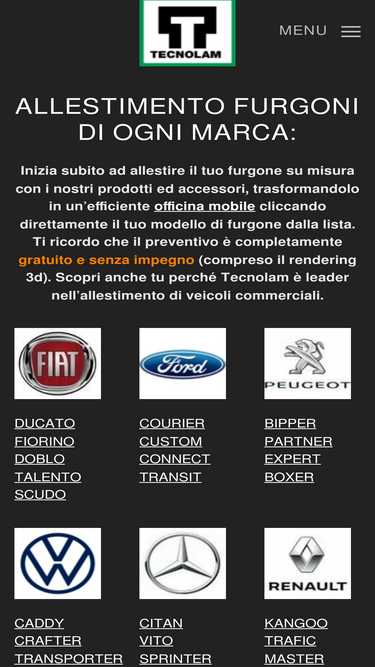 96%La linea professionale di allestimento furgoni TI-VAN permette di organizzare al meglio lo spazio del proprio veicolo, garantendo robustezza ed affidabilità a prezzi molto competitivi Arredare il proprio furgone significa trasformare il vano di carico in un’officina mobile vera e propria. Tecnolam Progetta e produce direttamente l'allestimento del tuo furgone