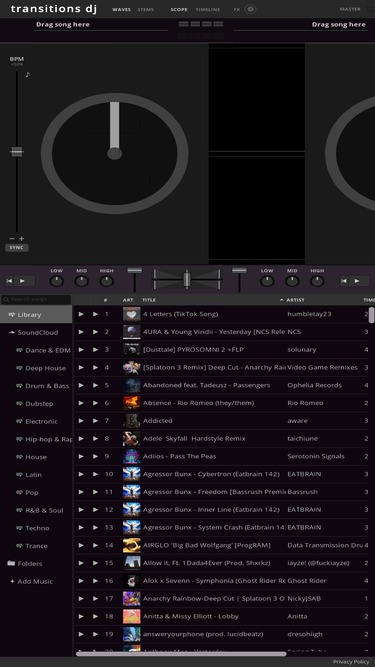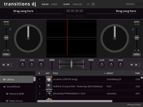 100%Transitions DJ is a web-based, ad-free DJ mixing app. Mix music online from SoundCloud or your own music collection.