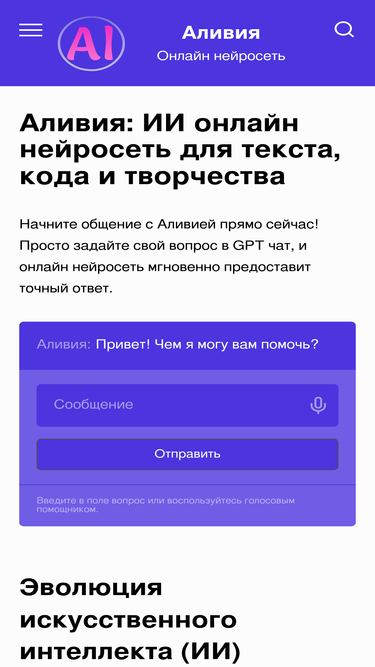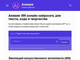 78%Бесплатный ИИ чат-бот Аливия для развлечений и творчества. Генерируйте шутки, играйте в ролевые игры и находите собеседника 24/7. Начните прямо сейчас!