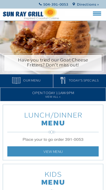 100%There's a little something for everyone at Sun Ray Grill. Owner & Chef Tom Hinyup and his hardworking crew invite you to enjoy a little something different on the West Bank in Gretna. Sun Ray Grill serves the freshest seafood available — selections change daily! Head to our Facebook page @sunray.grillgretna or call 391-0053 for our daily lunch and dinner specials.