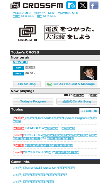 53%福岡 78.7mhz/北九州 77.0 mhz/行橋 87.2 mhz/久留米 86.5 mhz/大牟田。cross fmでのオンエア情報やトピックス・プレゼント、最新のヒットチャート、podcastなど情報満載!