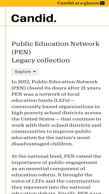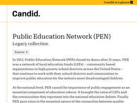99%In 2012, Public Education Network (PEN) closed its doors after 21 years. PEN was a network of local education funds (LEFs) -- community based organizations in high poverty school districts across the United States -- that continue to work with their school districts and communities to improve public education for the nation's most disadvantaged children. At the national level, PEN raised the importance of public engagement as an essential component of education reform. It brought the voice of LEFs and the communities they represent into the national education debate. Finally, PEN gave voice to the essential nature of the connection between quality public education and a healthy and thriving democracy.