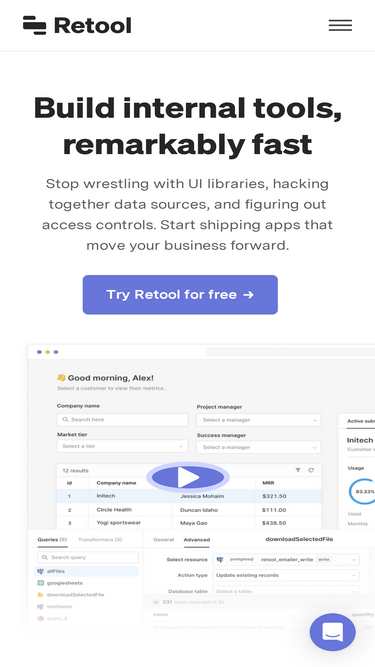 60%Build, deploy, and manage internal tools with Retool’s unified engine. Connect to any database, API, or LLM. Leverage AI throughout your business.