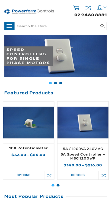 72%For wallplate options see the MSC1200WP family. The Powerform model MSC1200 controller provides stepless electronic speed control for single phase PSC induction motors in fan and blower applications. The speed may be varied using a front mounted rotary control knob, and the minimum speed can be adjusted by a side mounted adjustment trim pot. Suitable for applications of single or multiple / mixed use loads up to 1200VA 5 Amps 240 VAC. Can be used as standard for three wire applications, or for two wire applications the unit must be de rated by 40 %. Available with different mounting options and features to tailor fit any application.   Features - Australian designed and manufactured. 2 & 3 wire speed control compatible. Can control Multiple & dissimilar loads. EMC compliant. Available in panel mount, switch board mount or fitted with a HPM wall plate adaptor. Easy to follow detailed installation guide. Earth stud fitted for easy earth connection. Side mounted minimum set point adjustment to allow fine tuning of minimum speed.   For wallplate options see the MSC1200WP family. https://powerform.com.au/product/5a-speed-controller-msc1200wp/