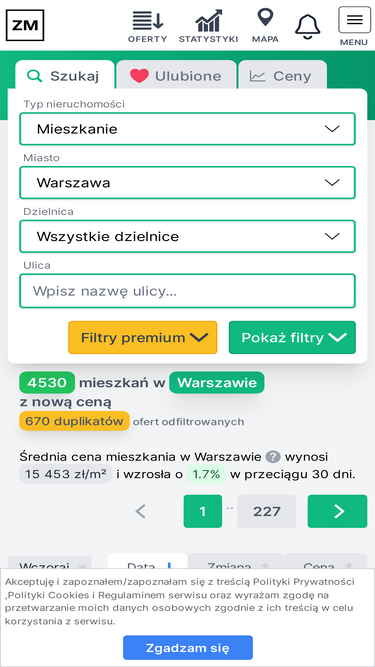 Zobacz jak zmieniły się dzisiaj ceny dla poszczególnych ofert. Średnia cena mieszkania w Warszawie wynosi 18 550 zł/m² i wzrosła o 0.4% w przeciągu 30 dni.