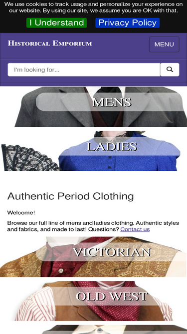 Serving You Since 2003 -- We specialize in authentic, high-quality period clothing, suitable for stage and screen, living history, and special occasions. We are proud to serve reencator and performing arts communities worldwide. We encourage you to shop our store, and please contact us if you have any questions. Historical Emporium - Authentic Period Clothing for Men and Women. Serving living history, theater, movie and TV production customers since 2003. Five star ratings from thousands of customers. How may we serve you?