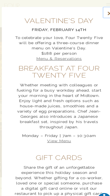 94%Four Twenty Five is a Contemporary, Elevated Restaurant in Midtown Manhattan, NY.