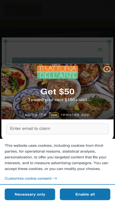 Across from Carnegie Hall, Trattoria Dell’Arte features the largest antipasto bar in New York, a sprawling selection of seafood and vegetable specialties perfect for parties of all sizes. Designed after a Tuscan artist’s studio. Private dining