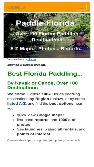98%best florida paddling, by kayak, canoe, or paddleboard. explore over 100 destinations, e-z google maps (no sign-ins req.) 1000's photos, see launches, find kayak, canoe rentals, paddleflorida.net.