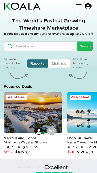 92%Rent direct from timeshare owners and book vacations at the world's best resorts for less. KOALA makes timeshare rentals easy, safe, and secure.