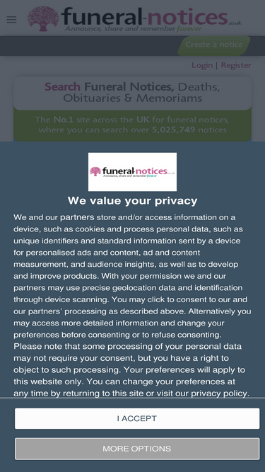 85%find local and national death notices, funeral notices, obituaries, in memoriams, acknowledgements and family announcements including birthdays, births, anniversaries and marriages at funeral-notices.co.uk