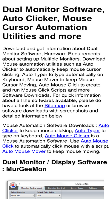 92%download dual monitor software utility to get better control of your dual or multiple monitors / display devices. auto mouse click software download to automate single / double left or right mouse clicks. auto clicker to keep mouse cursor clicking at current mouse cursor location. auto typer to type automatically on keyboard. download more mouse cursor automation utilities to automate mouse clicks or move mouse cursor automatically. give a try to murgee screen saver which unlike any other screensaver can save your computer screen by turning it off. download timer screensaver to display a digital countdown timer , save energy, save computer screen for single or multiple monitors connected to your computer system. information about setting up and using multiple or dual monitors, discussing software / hardware requirements for dual display / multiple monitor computer setup.