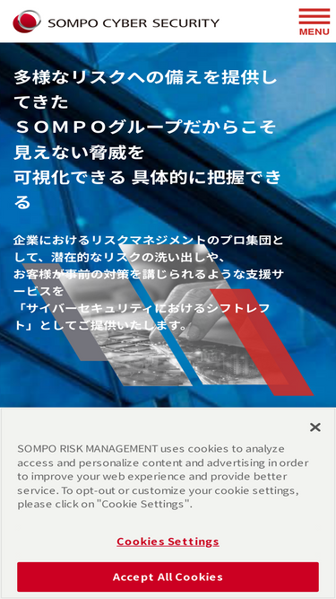 74%「お役立ち資料」の一覧ページです。SOMPO CYBER SECURITY サービスサイトです。SOMPO CYBER SECURITYは企業リスクのプロとした培った経営リスク対策の経験と実績に加え、豊富な実績のパートナーのソリューションと世界最先端の技術力で、お客さまごとのニーズに合わせた柔軟で最適なサイバーセキュリティサービスを提供いたします。