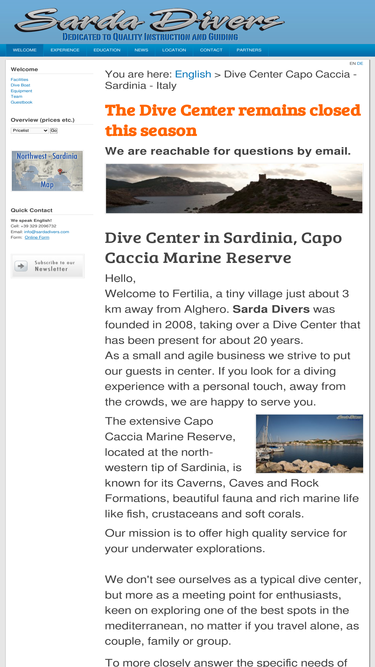 99%sarda divers offers english-spoken diving courses and dive trips for beginners and advanced divers in the capo caccia marine reserve near alghero, sardinia. our area offers underwater caves and stunning rock formations paired with rich marine life and is described as one of the best mediterranean dive spots.