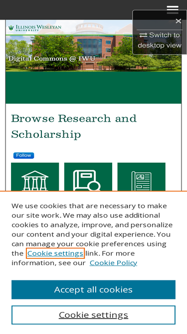 97%digital commons @ illinois wesleyan university (dc@iwu) reflects the nature of the intellectual, creative and scholarly culture of our campus. dc@iwu serves as the central location for outstanding student work, faculty scholarship, university records, and campus history.