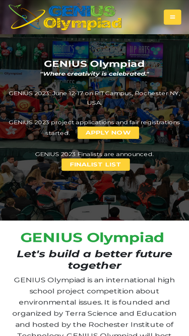 genius olympiad is an international high school project competition in science, engineering, art, short film, music, creative writing, robotics and business categories about environmental issues.