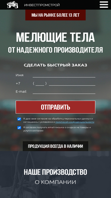 62%компания инвестпромстрой ведет свою деятельность с 2002 г. основным направлением деятельности является производство и поставка мелющих тел. производство расположено в г. рязань, головной офис-г. москва, так-же имеется склад готовой продукции в г. челябинск.