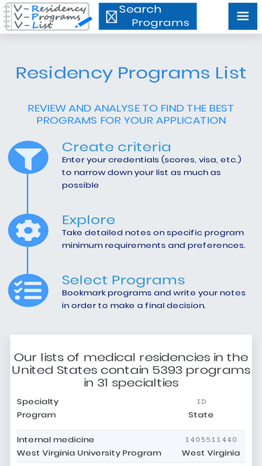 95%the list of residency programs in the usa. medical residencies by state and specialty. the most advanced search engine, unique ranking algorithms, and friendly interface to streamline your eras application. your personal residency finder.
