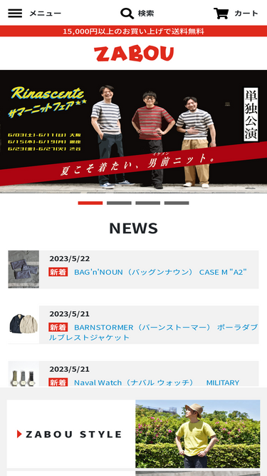 100%1997年6月に大阪・南船場にメンズセレクトショップ ”zabou (ザボウ)“をopen。リゾルト、セントジェームス、パラブーツ、バッグンナウン、ガンホー、スロウ、ダブルツリー、バス、ラッセルモカシンなど、国内、国外から様々なアイテムをセレクト。ファッション(流行)だけでなく、普遍的なスタイルがカッコいいという考えのもと、カッコいい普段着を追及。日々アイディアを振り絞ってスタイルをご提案致します。