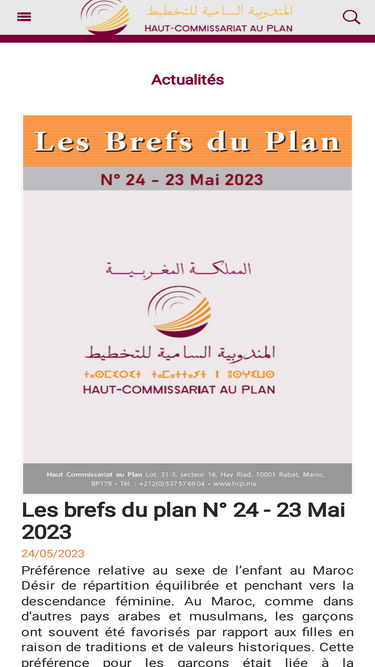 Le Haut Commissariat au Plan est le principal producteur de la statistique officielle au Maroc. C’est une structure administrative érigée en septembre 2003 en une administration de mission, sous l’autorité d’un Haut Commissaire au Plan nommé par Sa Majesté le Roi Mohammed VI, que Dieu l’assiste...