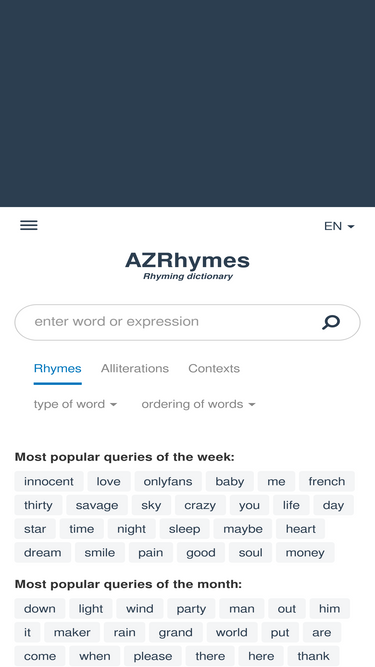 100%a unique online rhyming dictionary that contains a huge collection of rhyme suggestions for almost any given word in many languages.